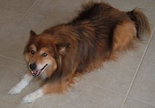 Molly is a 14 year old mixed breed dog. (Aussie/border collie or sheltie mix). She weighs about 40 pounds, and is brown, rust, and tan/cream with black tipped fur.