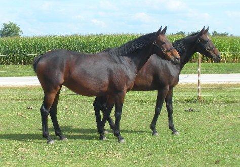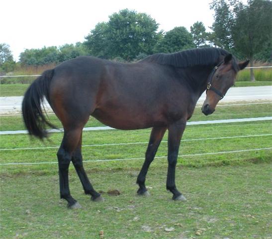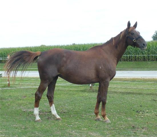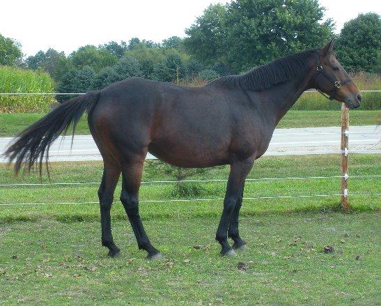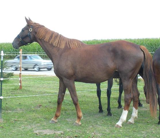 Last Dance "Libby". 1997 Trakehner mare by Pfeifen, (1997 USDF All-Breeds- First Level - 5th - 67.429%,1997 USDF HOY -First Level - 35th - 67.429%) and out of Lakritze (by Mikado (Impuls x Mirabel), who was imported to Canada by the German-born breeder, Gerda Friedrichs in 1968). 15.2hh. Libby shows a more than striking resemblance to her grandsire, Mikado. She has been started in groundwork, and is eligible for OSB approval upon inspection. She will be started under saddle in 2010.